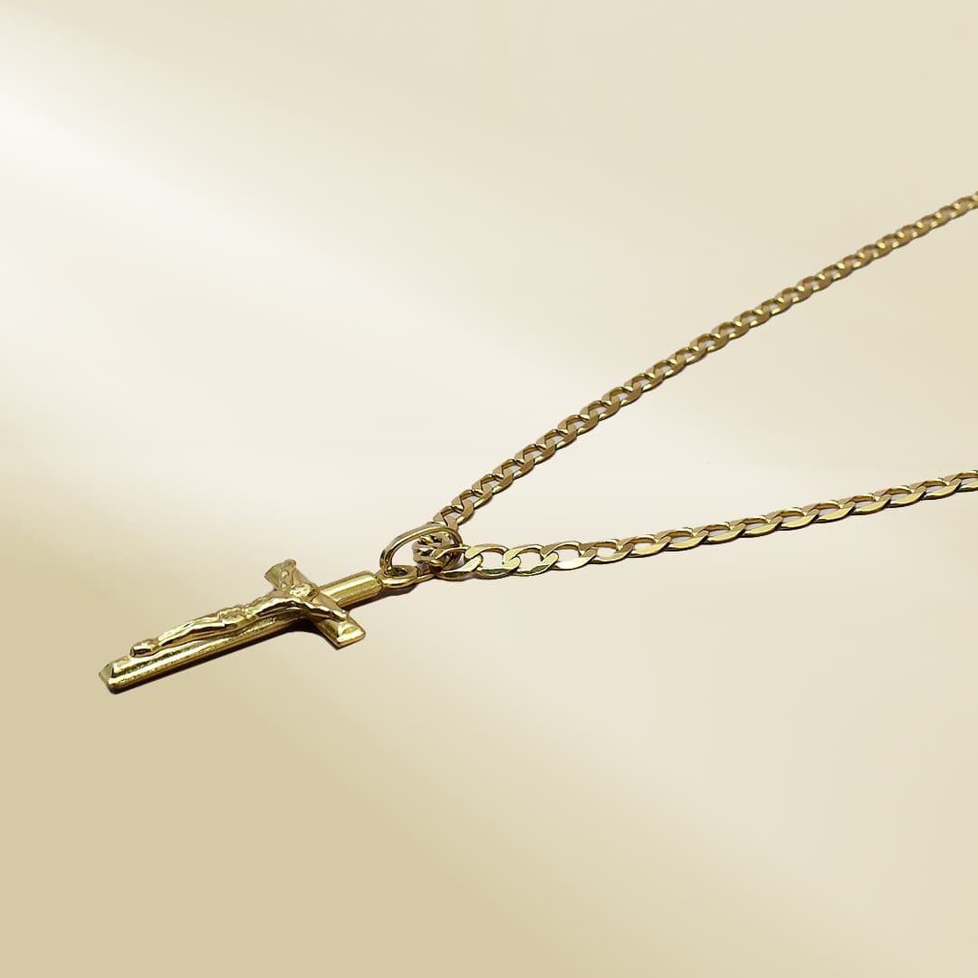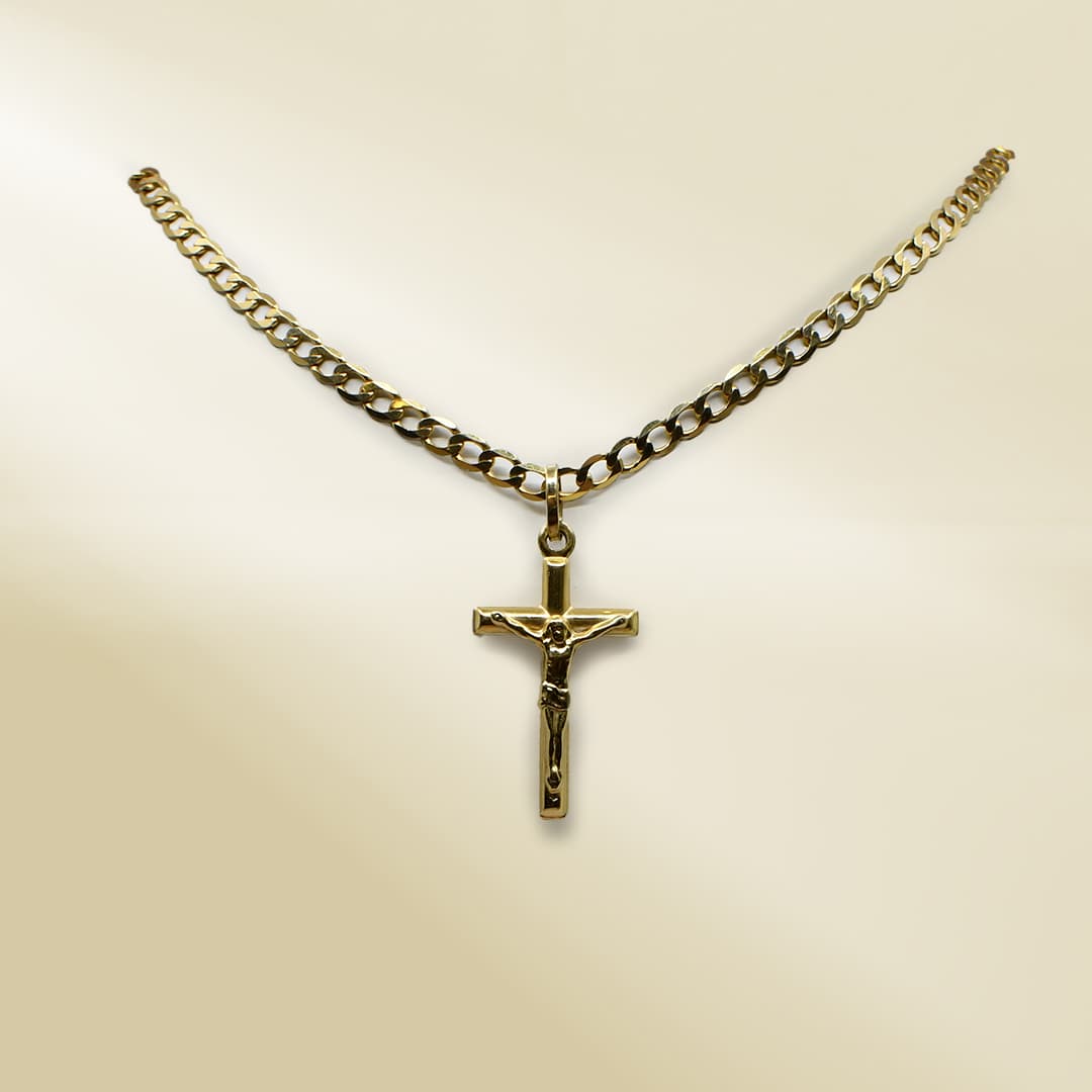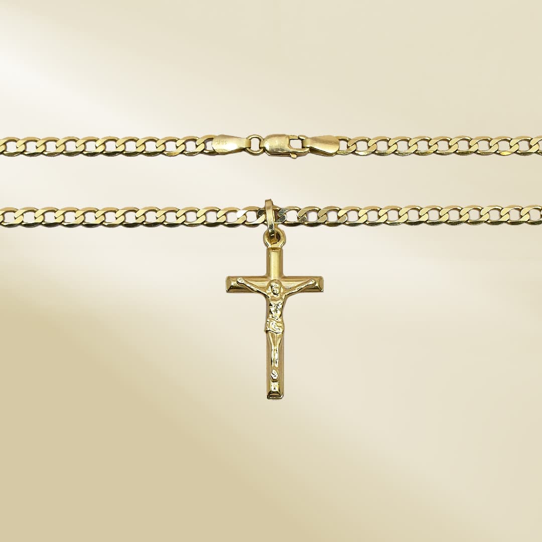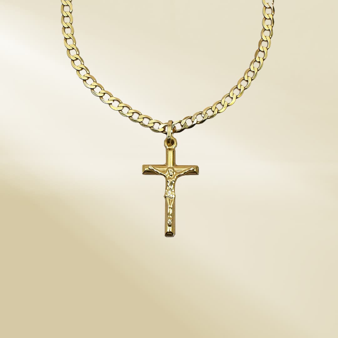 18K Yellow Gold Curb Chain Necklace with Cross Pendant