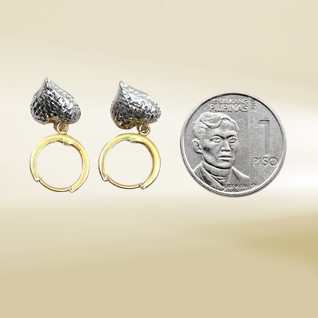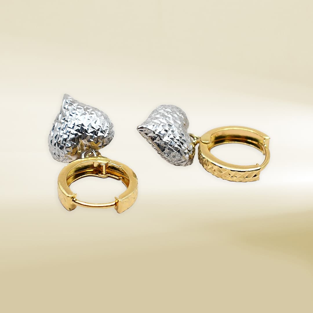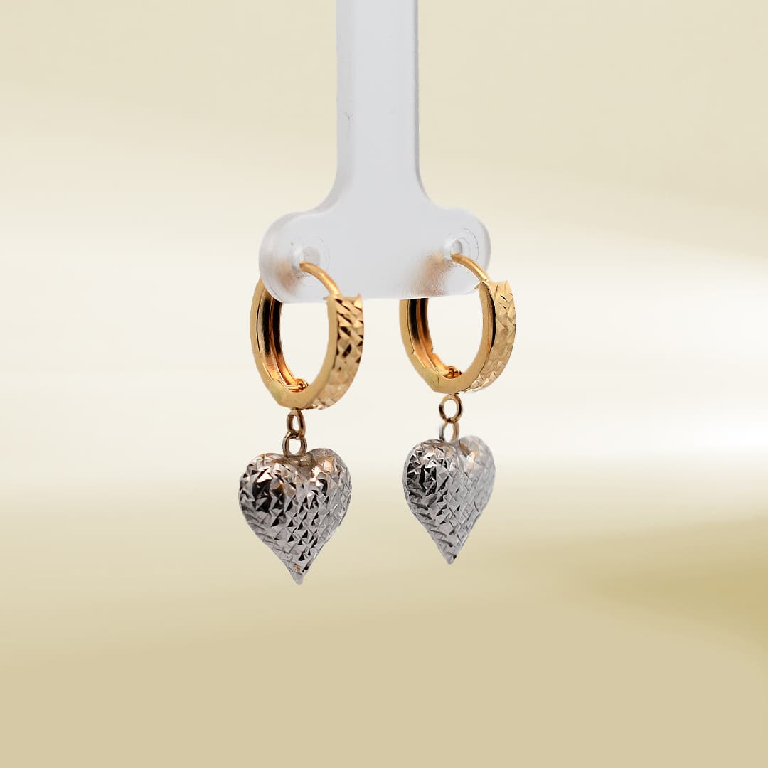 18K Yellow Gold Huggie with White Gold Heart Dangle Earrings